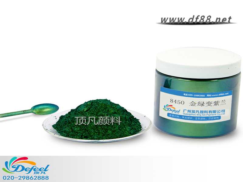 8450 金綠變紫藍變色龍粉可應用于涂料、油墨、塑料各產業,產品之設計大多以室內(無紫外光之環境)與室外(有紫外光之環境)有顏色變化為訴求。